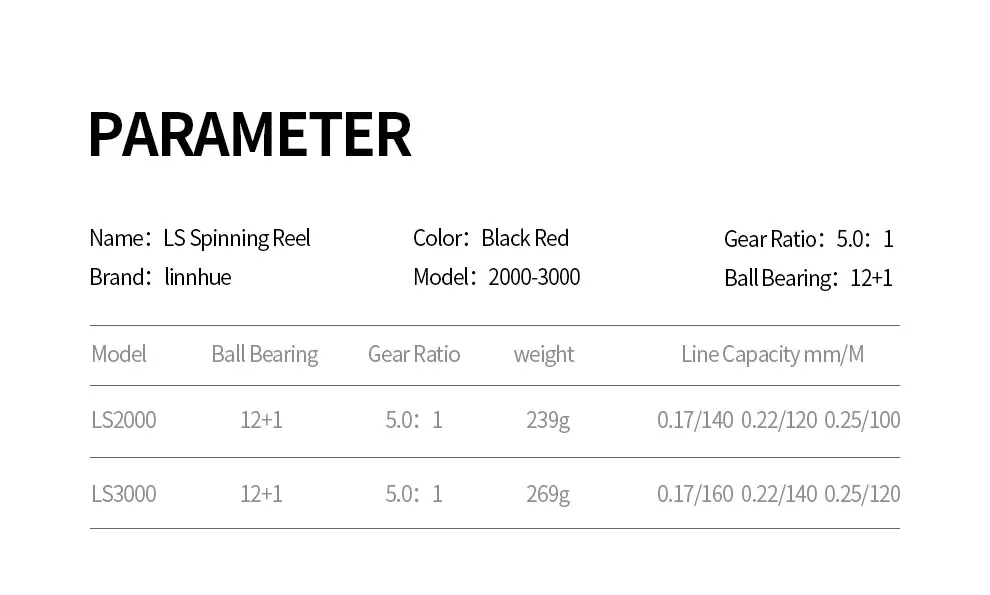 + Weight(shallow spool 2000/3000): 239g/269g + Weight(deep spool 1000-7000): 220g/225g/260g/270g/380g/380g/390g
